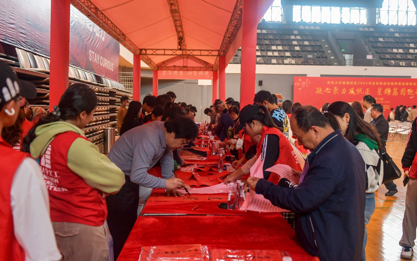 本次活动由深圳大学、深圳市文学艺术界联合会、深圳市书法家协会联合举办,深圳大学李永华副校长及深圳市书法家协会李静主席出席活动,并为迎新春福门点睛。李永华副校长用一副春联:兔跃荔园庆华诞,下联是龙腾神州谱新篇,横批:砥砺前行,与师生分享感受。他勉励师生要秉承特区精神,砥砺深大品格,把握机遇、善作善为,在新征程上放飞青春理想!