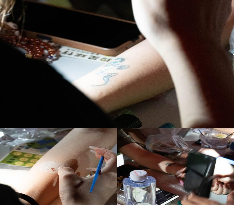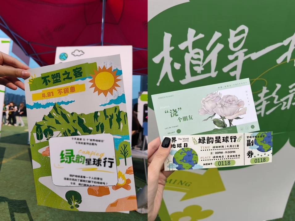 (ATP舞队表演) 5月17日晚上六点,文创节正式开始,同学们陆陆续续的来到了现场,驻足于自己感兴趣的摊位前。“地球工坊”“‘喷’出自然”“绘就地球”“人体彩绘”此类手工艺摊位点燃了同学们创作的灵感,用画笔和颜料映照出心中的彩色地球,喷绘出充满创意的独特帆布袋,又以人体作画布,将自己融为艺术的一部分。不仅如此还有手链制作和花艺创造的diy活动,同学们编织制作出春天里最靓丽的作品,用双手传递自然的魅力。同学们在可持续发展艺术画廊“‘植’得生活”驻足观赏,深深地被以绿色为主题的摄影作品展示出的蓬勃生机所感染,并留影打卡,他们每套中一个圈,答对一道环保小问题,就会发出一声兴奋的欢呼,就连路过的人都会被场地上欢乐的气氛所感染,加入到这场盛大的活动中去。