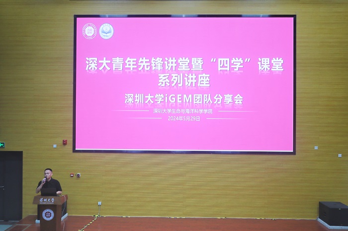 为弘扬深大精神,集中展示新时代深大青年的精神品格和价值追求,引导和激励我校广大青年师生不断进取开创、担当作为、攻坚克难,并贯彻倪嘉缵院士提出的“学做人、学做事、学知识、学思维”四大方面的育人要求,2024年5月29日,生命与海洋科学学院举办了深大青年先锋讲堂暨“四学”课堂系列讲座之深圳大学iGEM团队分享会。生命与海洋科学学院学院党委书记梁杰、深圳大学iGEM团队指导老师陈伟钊、团委书记陆佳运及各院学生参加了本次分享会。