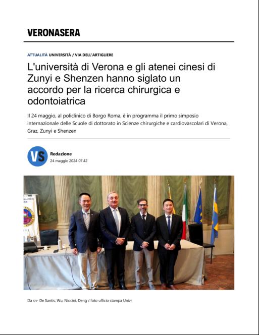 本次访问交流及谅解备忘录的签署预示着维罗纳大学与深圳大学的合作正式开启,未来中意双方将继续加强深入交流,在举办中意双方定期国际学术会议以及中意学生交流互换的基础上,不断加强在烧伤整形科、口腔医学、基础医学等领域的学术研究与医学转化合作。期待在不久的将来,双方在国际合作项目的申报及进行、国际学术会议的举办以及来华留学研究生招生等方面将取得丰硕的成果。 本次合作交流也得到了意大利当地媒体的关注,意大利维罗纳晚报对此次合作进行了报道。(https://www.veronasera.it/attualita/univr-cina-accordo-ricerca-odontoiatria-chirurgia-24-maggio-2024.html)