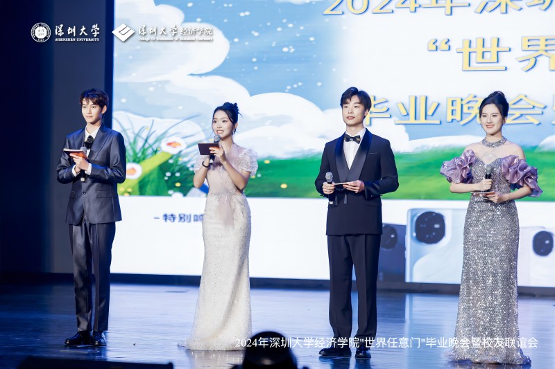 四位主持人的深情告别 随着晚会的圆满结束,我们再次向所有参与晚会的嘉宾、观众、表演者和工作人员表示最诚挚的感谢。感谢荣耀商城对本次晚会的独家冠名赞助和大力支持,感谢每一位为晚会付出努力的人。让我们共同期待经济学院的明天更加辉煌,祝愿深圳大学越来越好! “跨门触未来,世界任驰骋”,祝2024届毕业生前程似锦,未来可期!