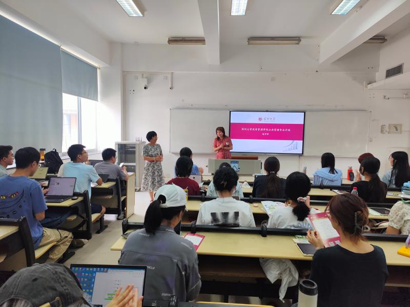 随后,深圳大学政府管理学院老师们到教室为华南师范大学政治与管理学院大三学生进行了招生宣讲。吴海燕副院长和赵宇峰教授分别对我院研究生培养概况和公共管理硕士点的学科发展、专业方向、奖助学金体系进行介绍,诚挚邀请华师学子到深圳大学政府管理学院参观交流,并鼓励大家积极报考深圳大学。
