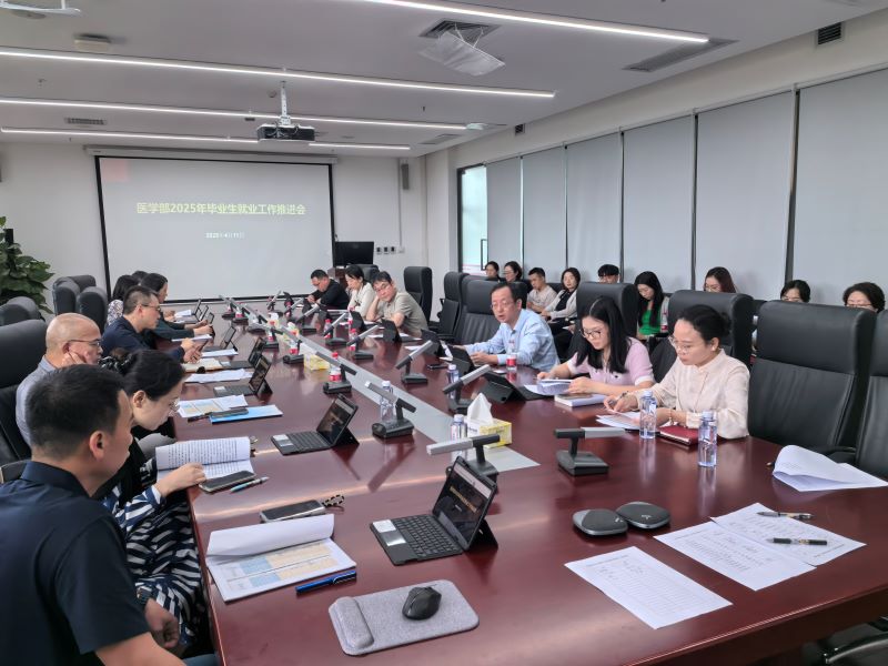 2025年4月11日下午,医学部在守慧楼911会议室召开2025年毕业生就业工作推进会。医学部党委书记殷涛、执行主任许兴智以及就业工作领导小组成员、学生工作办公室、本科教学办公室、研究生工作办公室相关职能部门负责人、各二级学院教学秘书、毕业生辅导员及班主任等30余人出席会议,会议由党委副书记王嘉蔚主持。