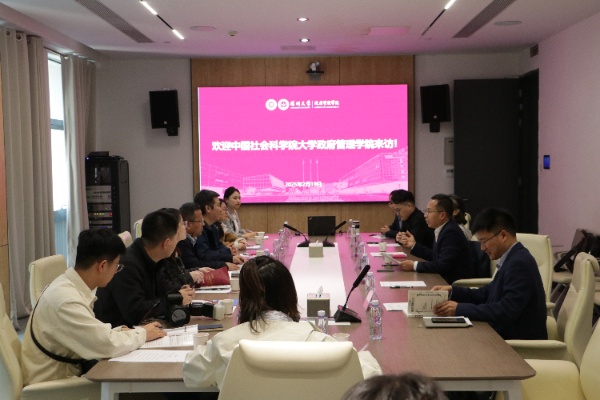 2025年2月19日下午,中国社会科学院大学政府管理学院执行院长蔡礼强教授,中国政治学会副秘书长、中国社会科学院政治学研究所政治制度研究室主任韩旭,中国社会科学院大学政府管理学院宣传与项目发展部主任高研春一行8人到访深圳大学政府管理学院,双方在守正楼B201会议室交流座谈。学院执行院长陈文教授、副院长谷志军教授、政治学系唐娟教授和袁超副教授、公共政策系段哲哲副教授、全球特大型城市治理研究院冯秀成副研究员出席座谈会。会议由谷志军主持。