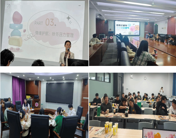 三、 聚焦学生需求,实施精准关怀与支持 学院密切关注学生身心健康,各班班会将心理疏导与成长关怀作为重点。针对期末阶段的学习生活压力,班主任们以“情绪温度计”等工具引入,积极引导学生进行自我评估与调节,通过推荐运动减压、组织朋辈交流、鼓励主动求助等方式,帮助学生保持积极心态。各班主任均结合班级具体情况,提供了个性化的关怀与建议,体现了育人工作的温度与精度。