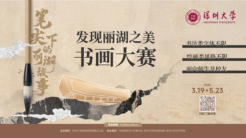 深圳大学丽湖校区占地面积1.38平方公里,位于深圳市南山区西丽国际科教城片区,北临阳台山,南接塘朗山,大沙河穿校园而过,依山傍水,环境优美,万物生光辉。1.7万余名师生徜徉其中,四季更迭皆是景,丽园生活住满情,情感文中抒,风景画里藏,值此春日盎然时节为契机,举办“笔尖下的丽湖故事”书画大赛,面向师生、校友征集主题书法和绘画作品。