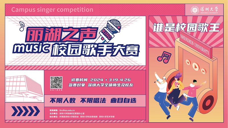 从深圳湾畔的粤海到羊台山下的丽湖,深圳大学已经成为一所特色鲜明、实力雄厚、在国内外具有良好声誉和重要影响力的高水平综合性大学,同时也是全国文明校园、中国十大最美校园之一。丽湖校区自2017年启用以来,重视校园文化建设,为增强文化自信,构建高雅韵致文化环境,以大学生喜闻乐见的艺术形式和校园文化为表现主体,弘扬时代精神,激发青春活力,充分展示我校师生积极向上的健康风貌,深圳大学丽湖校区将举办深圳大学“丽湖之声”校园歌手大赛。