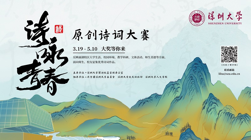 深圳大学丽湖校区占地面积1.38平方公里,绿化率超过90%,背靠羊台山,前拥塘朗山,脚踏大沙河,左右为南方科技大学和西丽高尔夫球会,羊台叠翠,塘朗烟雨,沙河鎏金,风光不与四时同,值此春日熙暖契机,举办“诗咏青春”诗词大赛,面向师生、校友征集主题诗词。